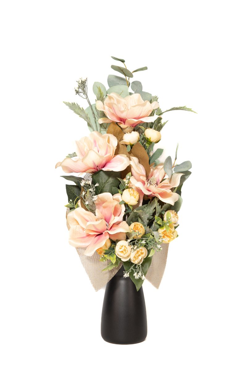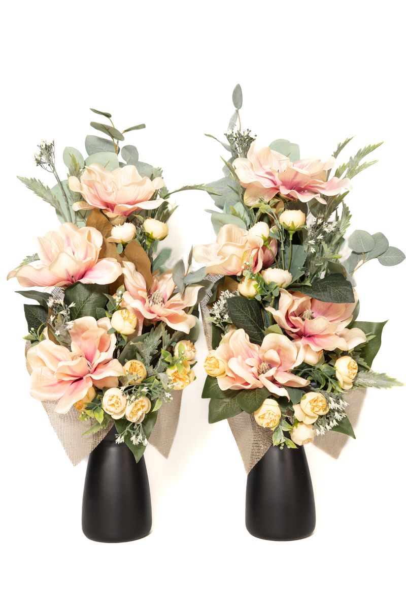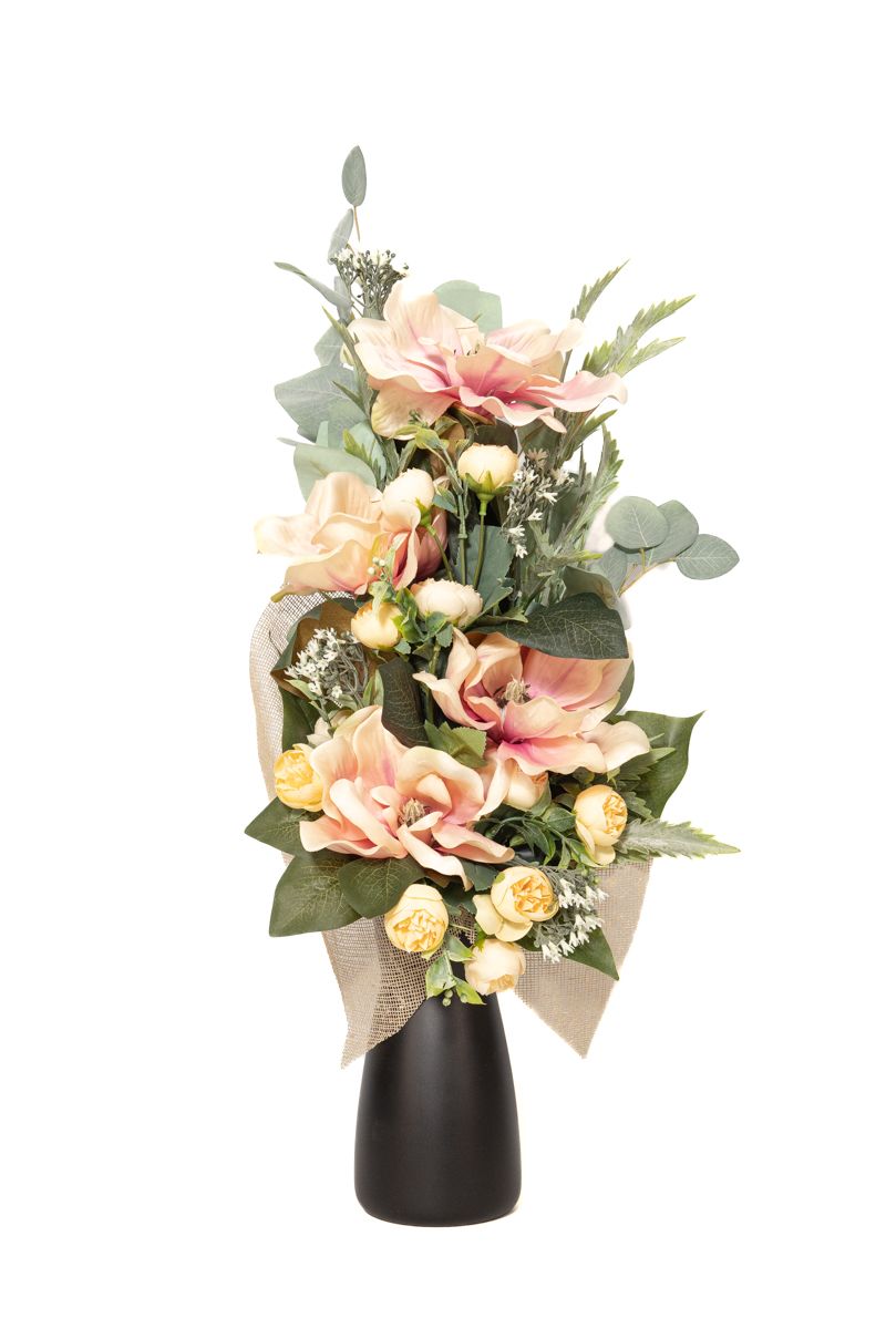 Este diseño floral para cementerio es increíble porque presenta grandes flores de magnolio artificiales. Son flores de alta calidad y durabilidad. Ideales para todo tipo de nichos, tumbas y lápidas de cementerio.