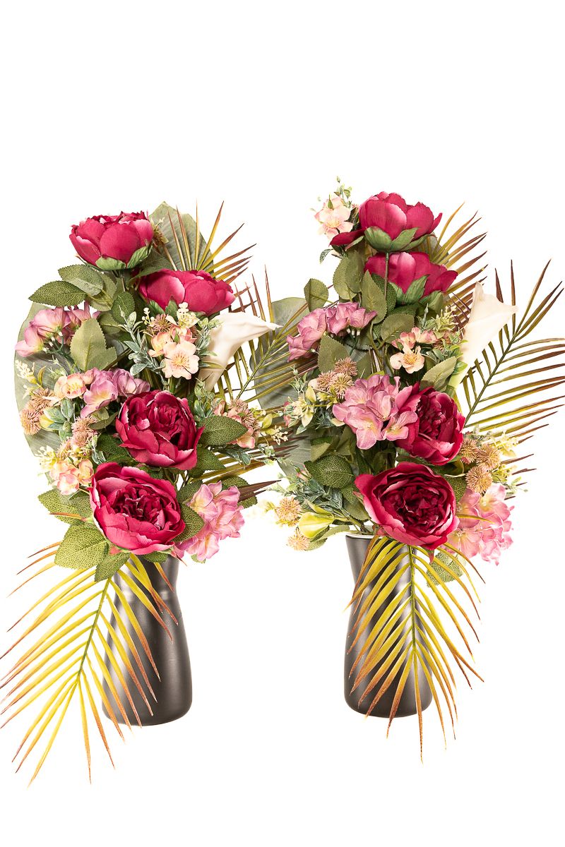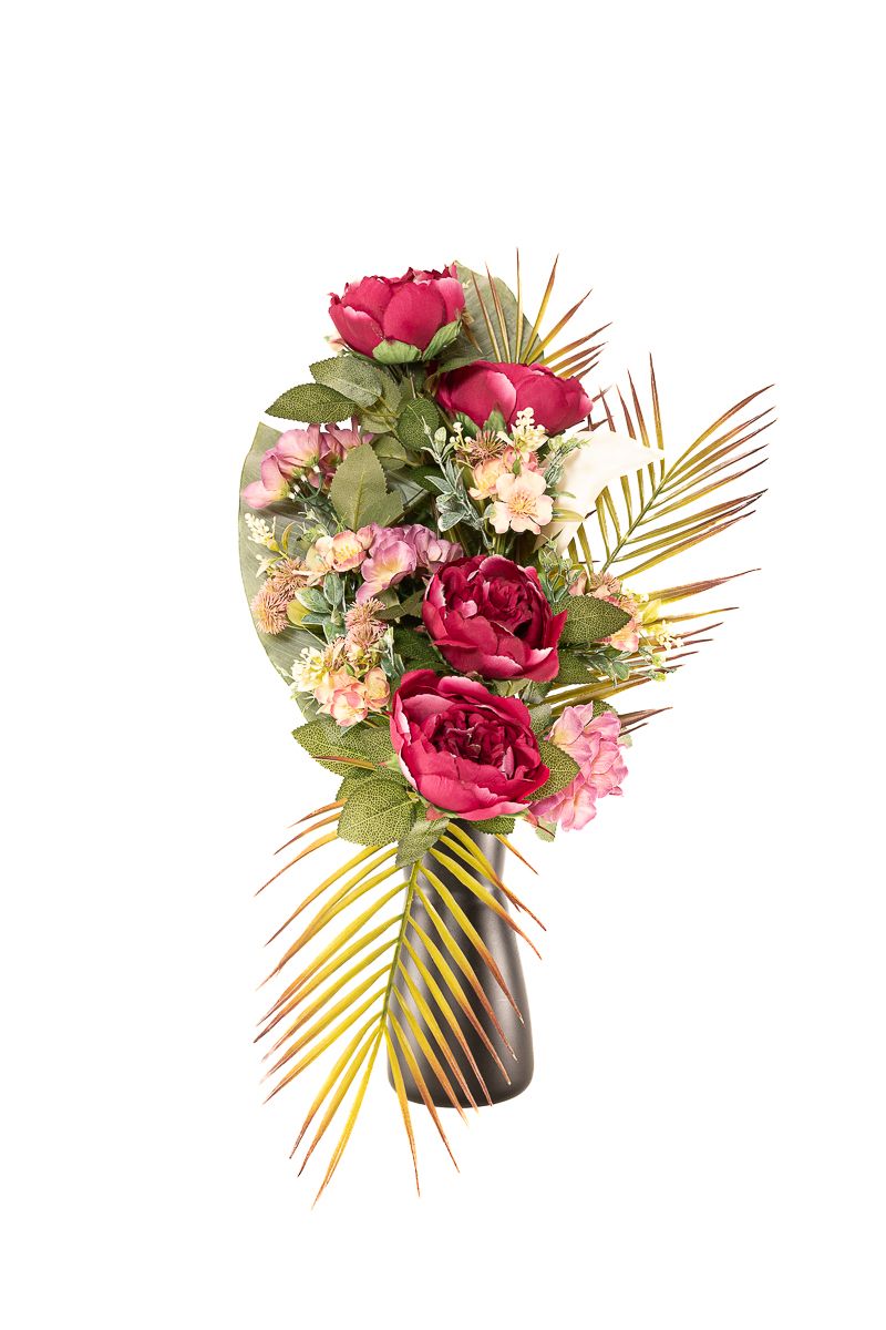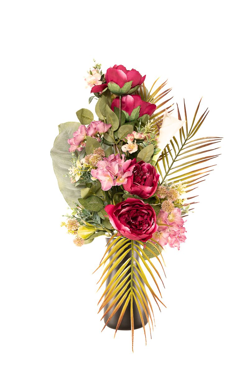 Un diseño llamativo y equilibrado que destaca por su mezcla de tonos vibrantes y hojas tropicales. Este ramo de flores artificiales de alta calidad combina peonías en color fucsia, hortensias rosadas y una elegante cala blanca, acompañadas de flores silvestres y verdes decorativos. Las hojas de palmera y strelitzia aportan un aire exótico y sofisticado, convirtiéndolo en un arreglo de cementerio duradero, ideal para lápidas, nichos o panteones con un toque distintivo y elegante.