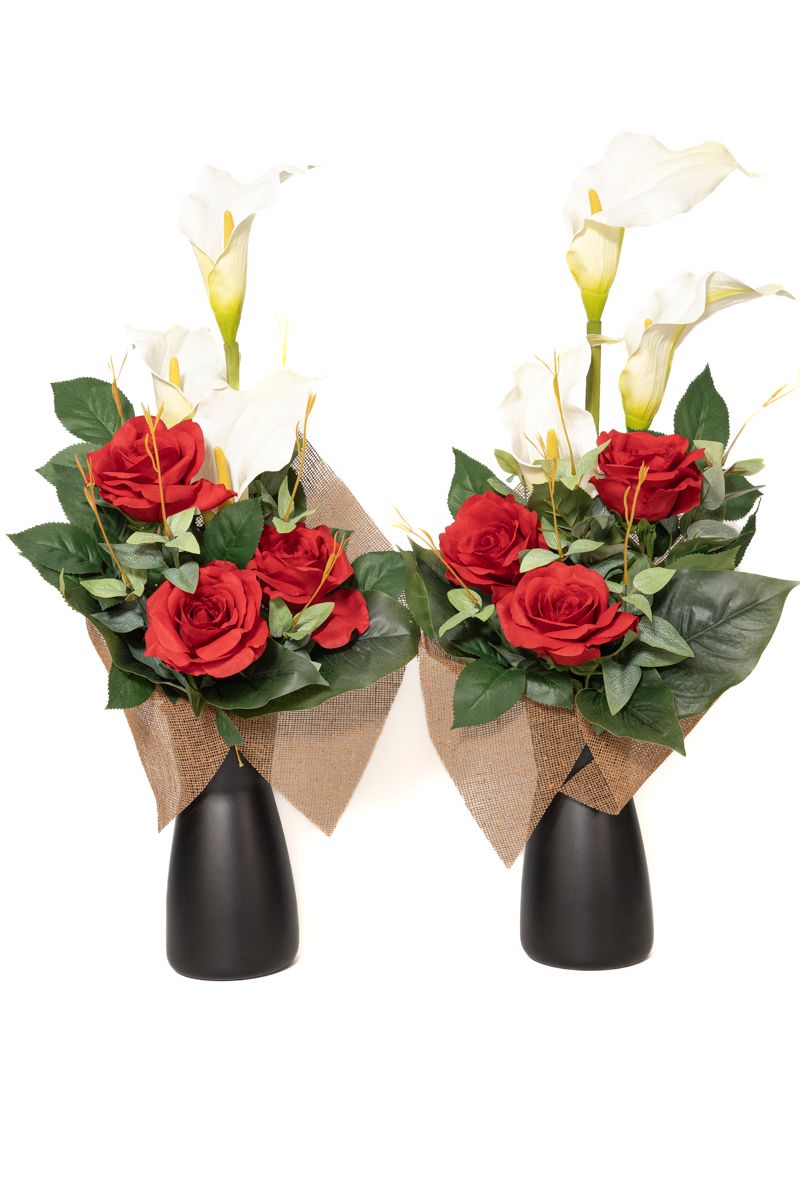 Este arreglo floral está inspirado en patios andaluces con grandes rosas rojas artificiales. Es un ramo de cementerio de alta calidad y durabilidad que junta a las rosas lleva lirios de color blanco. Elegante y muy andaluz. Ideal para todo tipo de tumbas y lápidas. Homenaje floral para los difuntos.