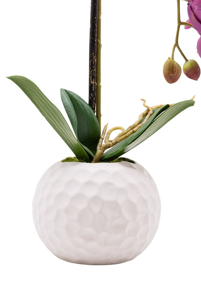 Una propuesta delicada y elegante donde los tonos lilas aportan un aire sereno y sofisticado. La orquídea Phalaenopsis destaca por la suavidad de sus flores y su equilibrio visual, creando una composición armoniosa que llena de calma cualquier espacio. Su acabado realista permite mantener siempre un aspecto cuidado y fresco, sin necesidad de mantenimiento, ideal para el día a día. El tiesto decorativo de cerámica en color blanco realza la tonalidad de la flor y aporta un contraste limpio y luminoso, perfecto para integrar la pieza en ambientes modernos, relajados o de estilo natural.
